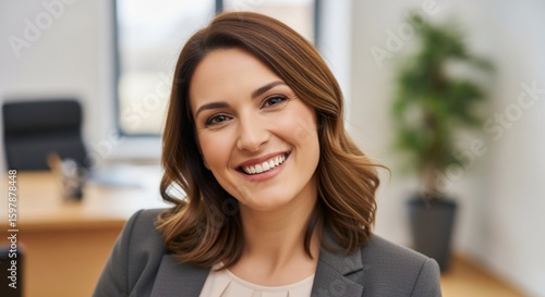 Radiant Businesswoman: Close-Up Portrait with Warm Smile in Modern Office Setting