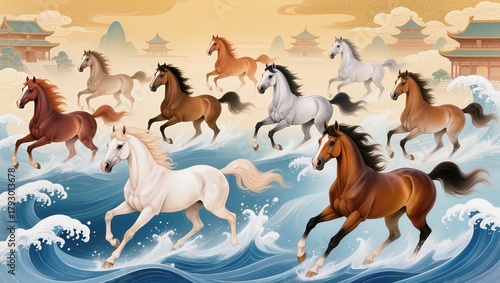 horse, fine art, wind, wave, galloping, radiant, powerful, detailed, classic, traditional, dynamic, feng shui, vitality, success, prosperity, fortune, heritage, spirit, oriental, noble, craftsmanship, wealth, timeless, beauty, majestic, divine, artistic, symbolic, culture, harmony, new year, blessing