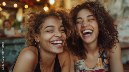 Radiant Smiles and Infectious Laughter Shared Between Two Young Women with Curly Hair in a Cozy Indoor Setting Bathed in Warm Bokeh Lights