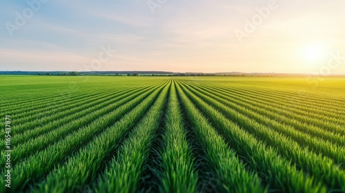 Radiant sunrise over a verdant meadow, serene landscape of green grass and golden light