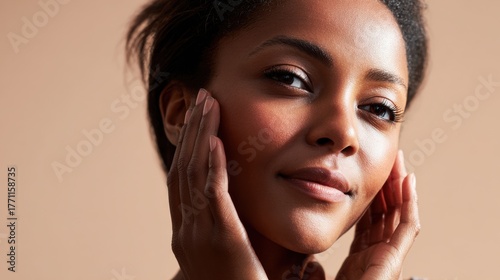 woman, face, skin, hand, eye, nose, lip, hair, cheek, person, portrait, closeup, beauty, natural, head shot, glowing, textured, soft, authentic, candid, beige, brown, warm, tan, light, smooth, clear, fresh, vibrant, healthy, calm, peaceful, serene, care, gentle, skincare, well-being, dermatology, african, female, wellness, youth, smile, happiness
