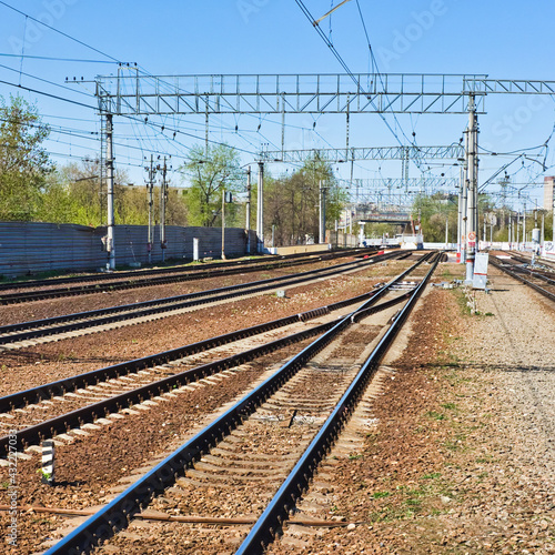 Railway lines at sunny day. Electricity poles and track line environment. Perspective sleepers and rails.
