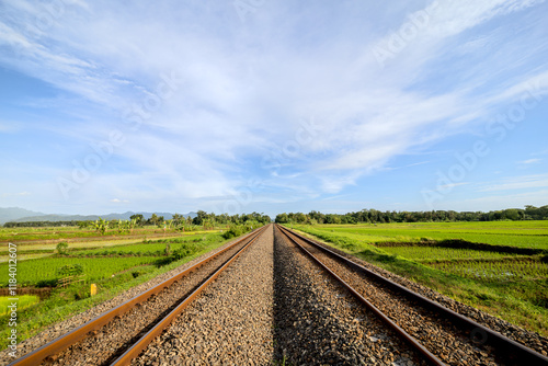 Railway Tracks Across Green Rice Fields on a Sunny Morning. Two-Way Railway Lines Through Rice Fields Under Clear Skies. Serene Morning View of Railway Tracks and Rice Paddies