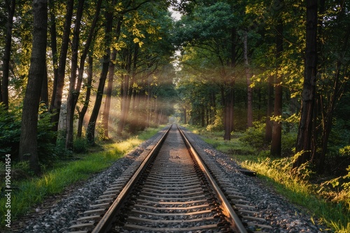 railway, track, forest, sunset, tree, sunlight, nature, landscape, railroad, train, path, wood, greenery, foliage, mist, gravel, rail, scenery, environment, filtering, through, serene, stretching, distance