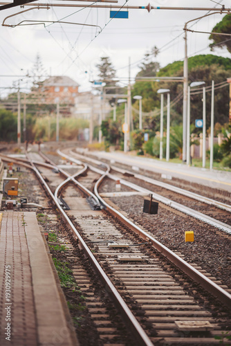 Railway tracks merge and split at a quiet station, flanked by soft greenery and distant buildings. The atmosphere feels calm and awaits the sound of arriving trains