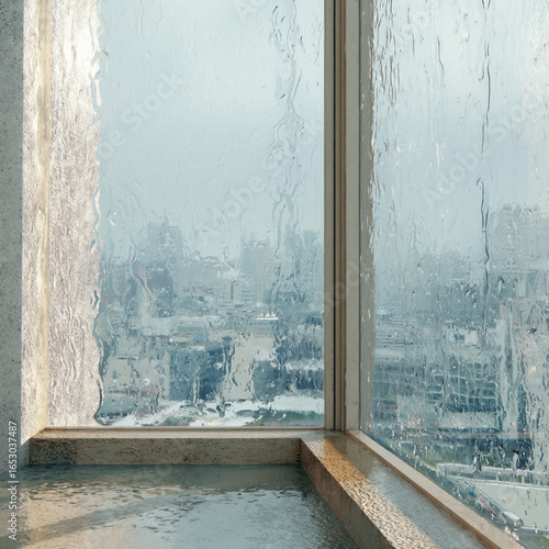 Rain cascades down modern window overlooking city skyline on a gloomy day
