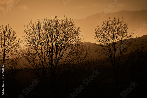 rain curtain at sunset with trees in front