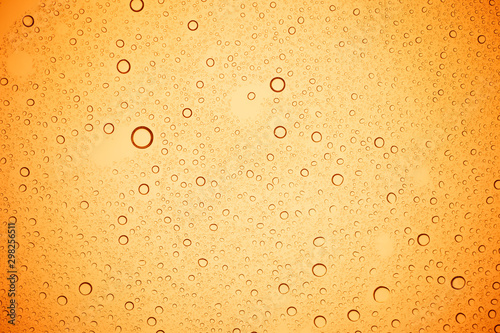 Rain droplets on yellow glass background, Water drops on yellow glass.