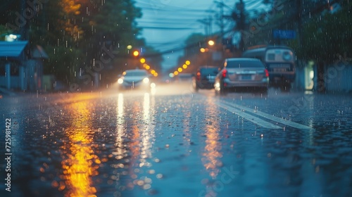 rain was falling on the roadway due to precipitation that was forming after depression hit Thailand causing heavy rain in some areas and flooding road surface. Behind the scenes of heavy rain