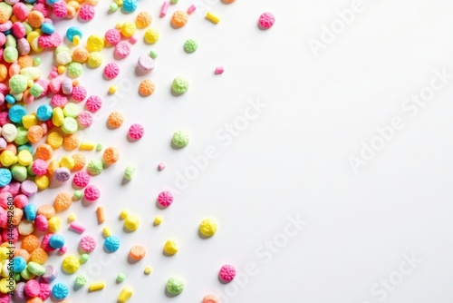 Rainbow candy sprinkles scattered on white, forming a festive pattern , sugar sprinkles, pastel, dessert
