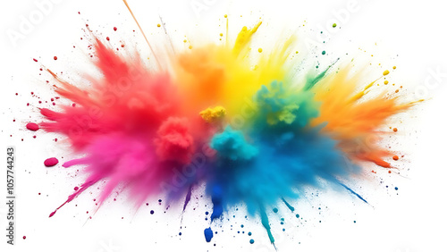 Rainbow colors explode on a plain white background amidst frame borders and colorful powders scattered all over.