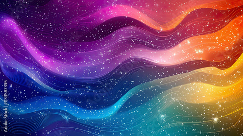 Rainbow gradient waves flowing softly, gentle starry dots sprinkled across, abstract and cosmic feel