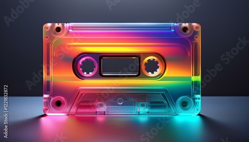Rainbow Neon Cassette Tape on Grey Table | レインボーネオンデザインのカセットテープがグレーテーブルに置かれた写真