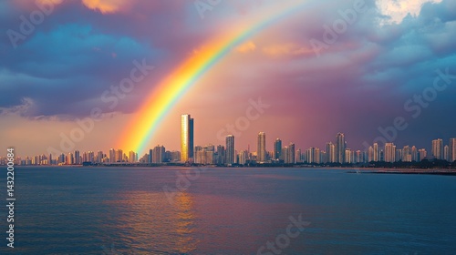 rainbow, city, skyline, sunset, ocean, water, building, tower, horizon, cloud, sky, colours, landscape, urban, nature, view, scenery, beautiful, amazing, spectacular, vibrant, gold, purple, blue, pink, orange, light, photo, picture, image, photo, art, travel, city landscape, metropolis, architecture, seascape, coastal, panorama