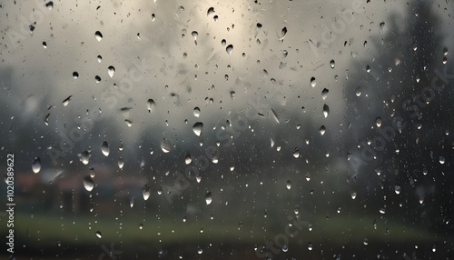 Raindrops on a glass window, with a blurred outdoor scene visible through the glass
