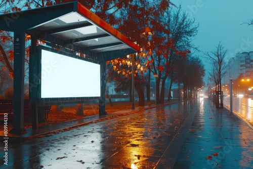 mock-up, billboard, bus, stop, rainy, weather, urban, city landscape, advertising, marketing, outdoors, street, transportation, public, transit, empty, template, space, commercial, promotion, communication, digital, display, blank, design, graphic, brand, showcase, street scene, wet, raindrop, bus stop
