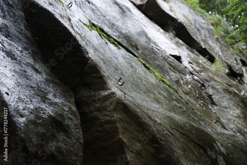 Rain-Soaked Rock Face with climbing fixed bolts outdoors
