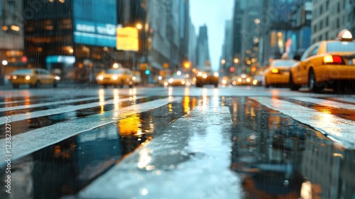 Rainy City Street at Night with Yellow Taxis and Blurry Cityscape Background