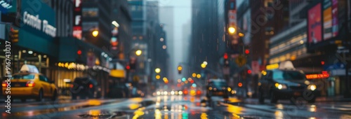 Rainy cityscape at night. A blurry, yet captivating picture of an urban scene, featuring rain falling on a street illuminated by streetlights and the reflections of vehicle lights on the wet asphalt.