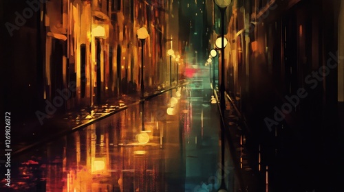 alleyway, city, night, rain, light, street, wet, dark, urban, building, shadow, glow, ambience, mood, atmosphere, water, puddle, orange, yellow, gold, brown, teal, blue, green, colours, painting, artwork, art, illustration, digital, image, graphic, design, texture, abstract, impressionistic, style, scene, perspective, depth, contrast, light, street light, wetness, reflections, city landscape