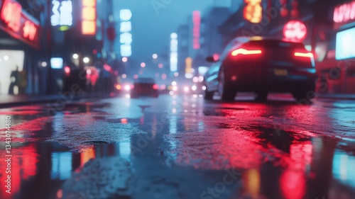 city, street, rain, night, neon, light, wet, pavement, car, driving, blurred, background, low, perspective, urban, traffic, city landscape, nightlife, atmosphere, mood, dark, colourful, vibrant, red, blue, light, water, texture, wetness, asphalt, street light, building, vehicle, motion, blur, sharpened, ground, level, view, scene, photo, effect, speed, rush, hours, drop, headlamp