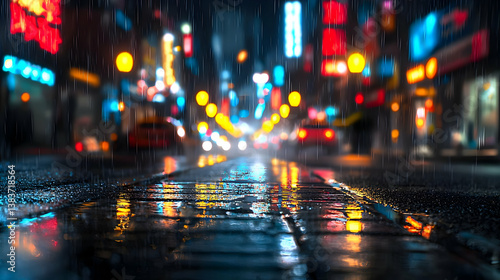 Rainy Night City Street Scene With Colorful Lights