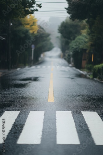 rain, road, street, japan, asphalt, yellow, line, crosswalk, tree, nature, wet, weather, urban, city, scene, pedestrian, crossing, transport, transportation, journey, travel, landscape, environment, nobody, paseo, safety, surface, stripes, white, mark, destination, perspective, view, background, blur, sharpened, town, fog, misty, season, autumn, fall, foliage, lane, path, way, overcast