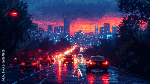 rainy, urban, drive, city landscape, twilight, metropolis, dreamy, painting, glow, light, vista, moody, headlamp, peaceful, glowing, driving, skyscraper, shimmering, dramatic, lonely, gloaming, speed, illuminated, perspective, work, atmospheric, aesthetic, commute, night, futuristic, pretty, highway, tranquil, vehicle, romantic, fast, nice, retro, dusk, way, vibrant, car, blur, home, rain, cool, light, downtown