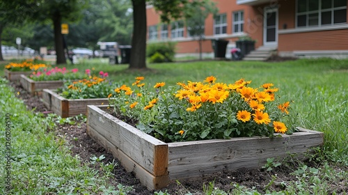 Raised flowerbeds with orange flowers in a residential neighborhood. Possible use Stock photo for gardening, urban landscaping, neighborhood, or community gardens