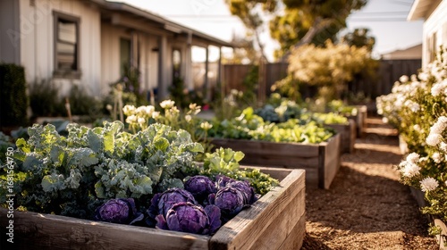garden, cabbage, kale, vegetable, plant, backyard, home, gardening, organic, food, agriculture, farm, harvest, growth, leaf, wooden, box, row, sunlight, dirtied, gravel, path, flower, blossom, bloom, white, house, building, exterior, residential, neighbourhood, suburb, fence, tree, summer, season, nature, environment, rural, lifestyle, healthy, fresh, produce, cultivation, horticulture, botany, flora, foliage