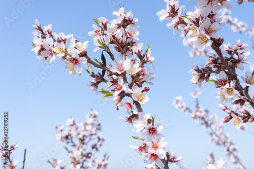 Rama de almendro en flor con cielo azul de fondo