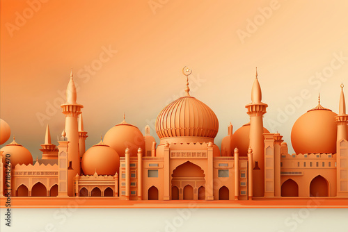 Ramadan Greetings Card. Mosque-Inspired Design with Islamic Symbols, 3D style