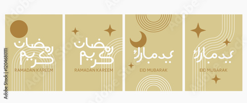 Ramadan kareem and eid mubarak greetings in simple boho style with arabic calligraphy. Simple design for islamic event. Vector Illustration.