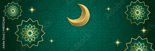 Ramadan Kareem banner background. Ramadan islamic holiday design templates with gold crescent moon, hand drawn lettering and mosque. Vector illustration.