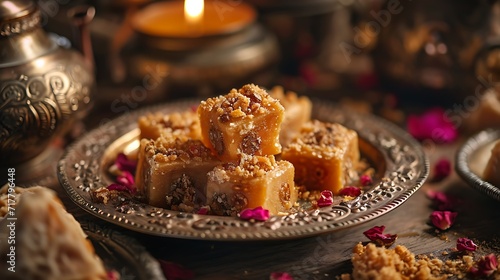 Ramadan muslim holiday background wallpaper design, food, sweets, cake, cookies, baklava, kunafa, Qatayef, halva, close up, sweet, sugar, eid al, stock photo