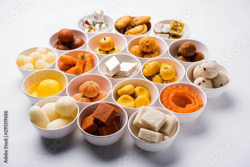Rangoli of Assorted Indian sweets/mithai in bowl for Diwali or any other festivals, selective focus