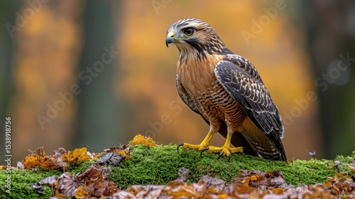bird, bird of prey, hawk, eagle, forest, autumn, fall, nature, wildlife, bird of prey, moss, log, leaf, orange, brown, green, sharpened, detail, sharp, profile, perched, standing, watching, hunting, predator, conservation, photo, animal, feather, wing, beak, eye, colourful, forest floor, environment, beauty, moss-covered, autumn, scenic, birdlife, bird of prey