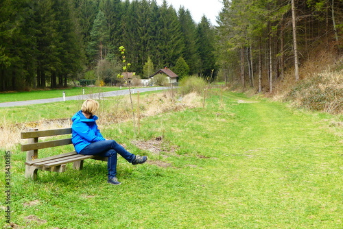 hike, rest, bench, sitting, nature, grass, park, park bench, forest, people, young, happy, person, recreation, lifestyle, walk, field, austria