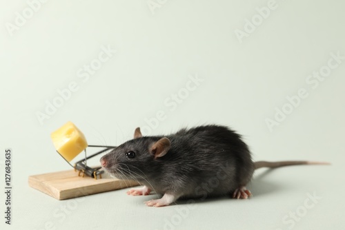 Rat and spring-loaded bar mousetrap with piece of cheese on light background