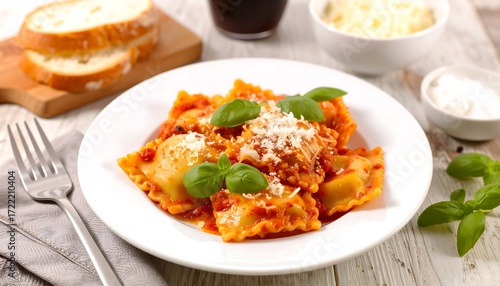 ravioli, pasta, tomatoes, sauce, basil, cheese, parmesan, italian, food, plate, meal, dinner, lunch, dish, appetising, delicious, epicure, fresh, healthy, kitchen, wooden, table, ingredient