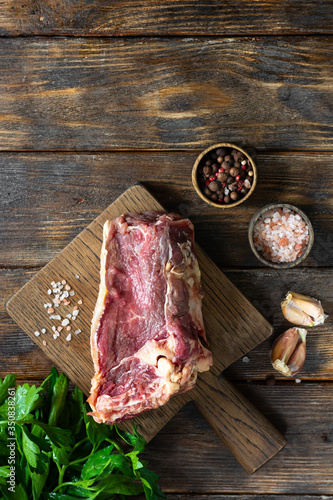 Raw beef meat on a wooden Board on a brown wooden kitchen table. A fresh piece of beef. Top view with space for text