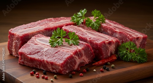 beef, meat, rib, slice, raw, cooking, fresh, parsley, spice, red, natural, epicure, closeup, wood, wooden, cutting, food, ingredient, prepared, tasty, appetising, delicious, healthy, macro, studio, isolated, meal, dish, brown, surface, preparation, culinary, rustic, receipe, consumption