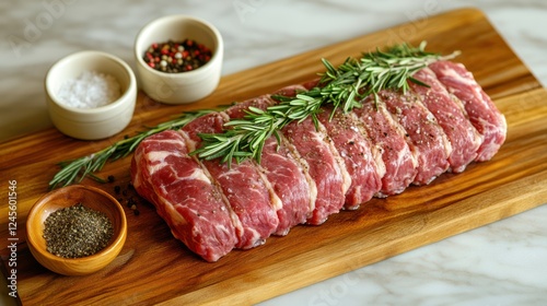 beef, roast, raw, meat, steak, food, culinary, cooking, ingredient, seasoning, salt, pepper, rosemary, herb, spice, fresh, delicious, healthy, protein, dinner, lunch, receipe, epicure, eatery, kitchen, wooden, board, cutting, table, marble, background, preparation, grill, bar-b-q, butcher, market, premium, quality, organic, natural, appetising, red, marbling, texture