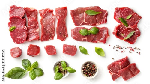 Raw beef slices and items isolated on white background viewed from the top