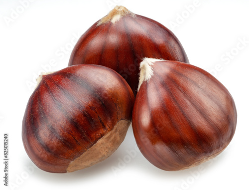 Raw chestnuts isolated on white background. Portuguese traditional snack autumn street food.