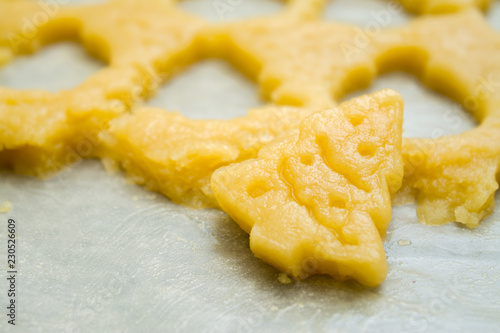 Raw dough for christmas cookies for children, making gingerbread in form of fir tree close-up. Recipe of New year treat. Homemade bakery, xmas sweet, winter holidays concept