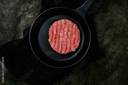Raw Ground beef meat Burger steak cutlet served on metal frying pan over the kitchen towel. Rustic metal background. Top view