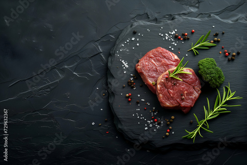 Raw meat steak in spices on a black table. Top view
