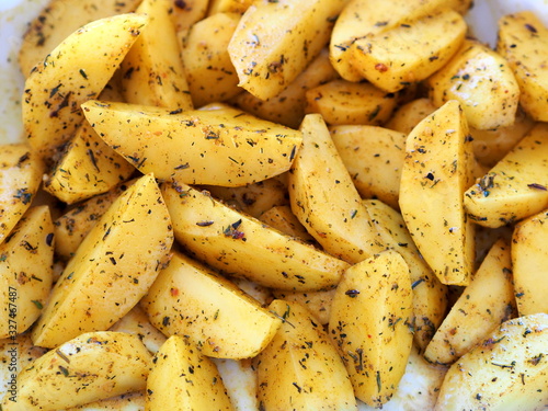 raw, potato, wedge, baked, closeup, cook, cooking, crispy, cookery, delicious, dinner, dish, food, fresh, gold, healthy, herb, homemade, organic, roasted, rosemary, slice, sliced, snack, spice, spicey, vegetable, vegetarian, yellow