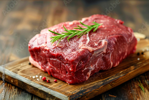 Raw red meat on a wooden board. Fresh meat from grass-fed and free-range animals